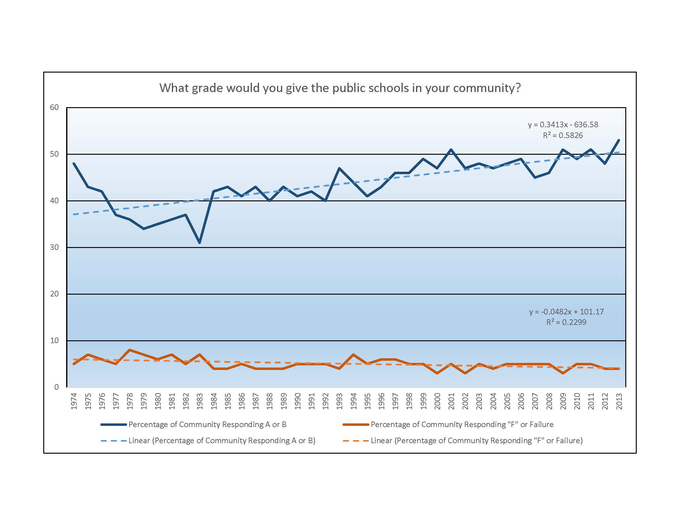 According to the most recent survey conducted by Gallup in 2013, about 53 percent of Americans would give the schools in their local communities a grade of A or B. This is the highest percentage ever reported in the forty years that this question has been asked. And the trend is up. Now more than ever before, people give their local schools high marks. At the same time, only 4 percent say the schools in their local communities deserve an F. And this percentage is declining.