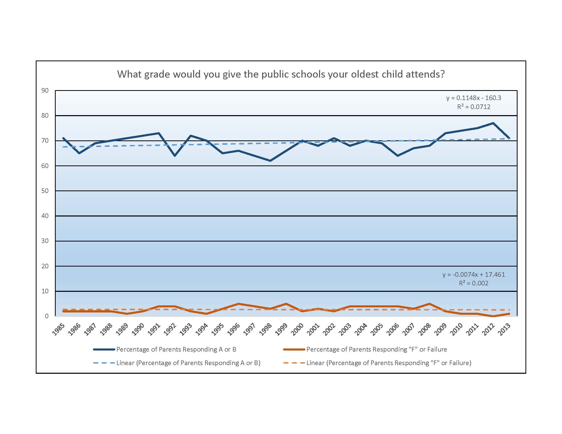 The above trend represents the opinions of everyone in the sample, whether they have children in the local schools or not. The Gallup survey also asked parents the same question and the results are even more favorable. This year 71 percent of respondents who were parents rated their oldest child’s schools as deserving an A or a B and only 1 percent gave their own schools an F. For some reason, last year fully 77 percent of parents gave their child’s schools an A or B grade, and amazingly, zero percent assigned an F to their own child’s school.