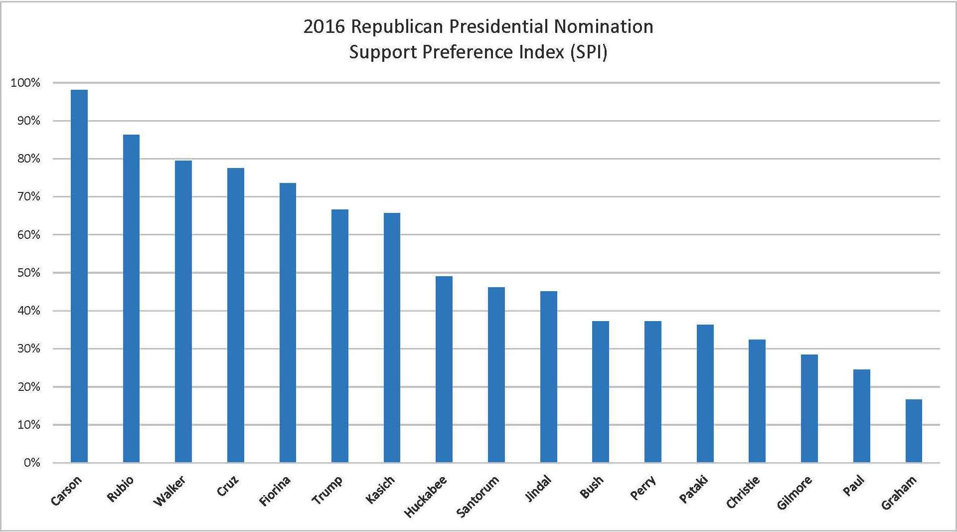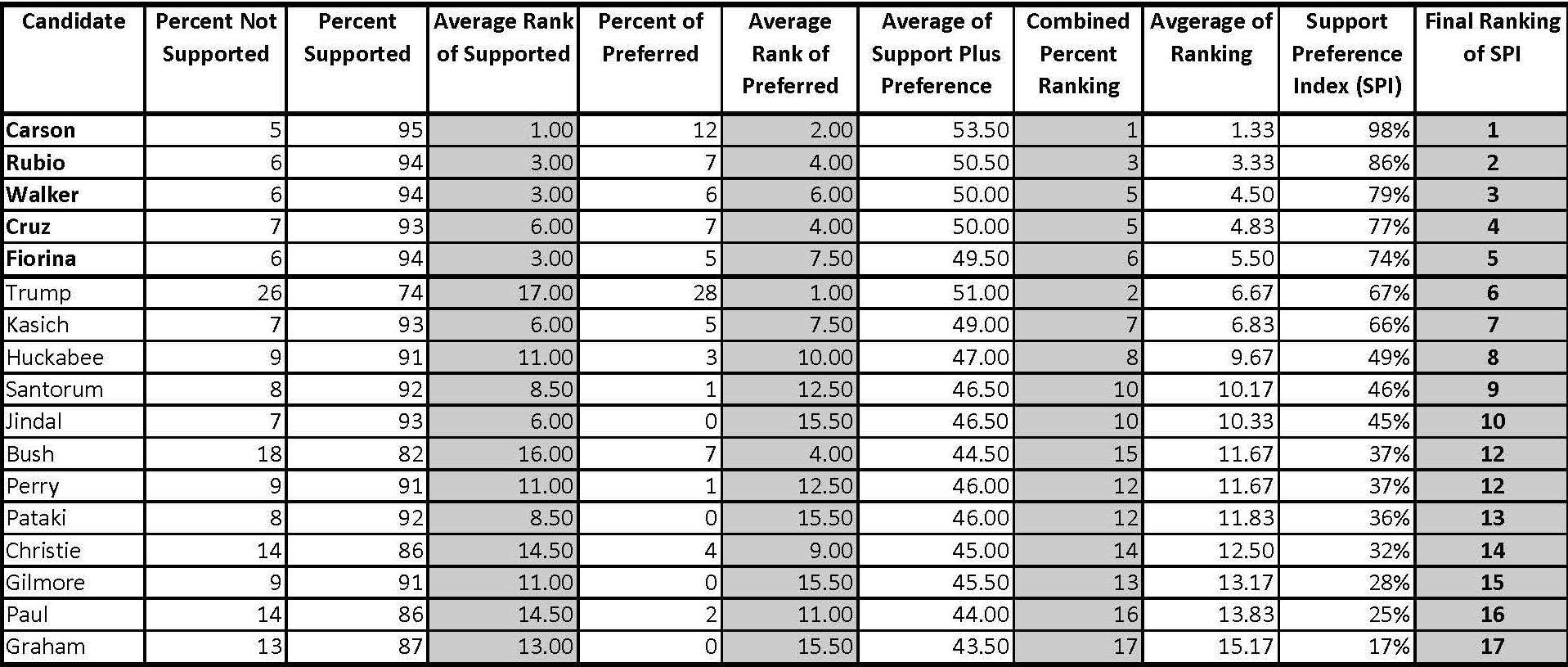 By combining the results of these three questions, I developed a Support Preference Index (SPI) which is a measure of how close a candidate is to being ranked first using all three calculations. The top five candidates (rankings in parentheses) using this analysis are: